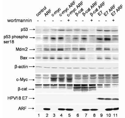 The tumor suppressor protein p53 is one of the major negative regulators of cell proliferation. Activity of p53 is kept low in normal circumstances, but it can be activated in response to various stresses or signals for cell growth and division. It has been shown that oncogenes c-myc and E2F1 can induce the activity of ATM/ATR kinases that in turn leads to phosphorylation and activation of p53. Also upregulation of ARF leads to activation of the p53 pathway by inhibiting Mdm2 protein activities. To address whether these two mechanisms can co-operate for p53 activation, we first transfected ARF null MEFs with c-myc, beta-catenin, and HPV-18 E7 oncogenes, and analyzed the changes in the level and phosphorylation status of p53. Western blot analysis revealed that overexpression of oncogenes induces the accumulation of p53 protein and p53 serine 18 phosphorylation independently of ARF as shown in Figure 1, lanes 3, 6, and 9. This was accompanied by the activation of p53-dependent transcription as indicated by the accumulation of Mdm2 and Bax proteins in Figure 1, lanes 3, 6, and 9. To determine the role of ARF in the activation of p53 upon oncogene overexpression we cotransfected ARF null MEFs with oncogenes and ARF. Both the level of p53 and its phosphorylation at Ser18 were further elevated in Figure 1, lanes 4, 7, and 10 compared to oncogene expression in the absence of ARF (Figure 1, lanes 3, 6, and 9) or ARF expression without oncogenic stimulus (Figure 1, lane 2). This shows that ARF and different oncogenes have a cooperative effect on induction of p53 pathway.